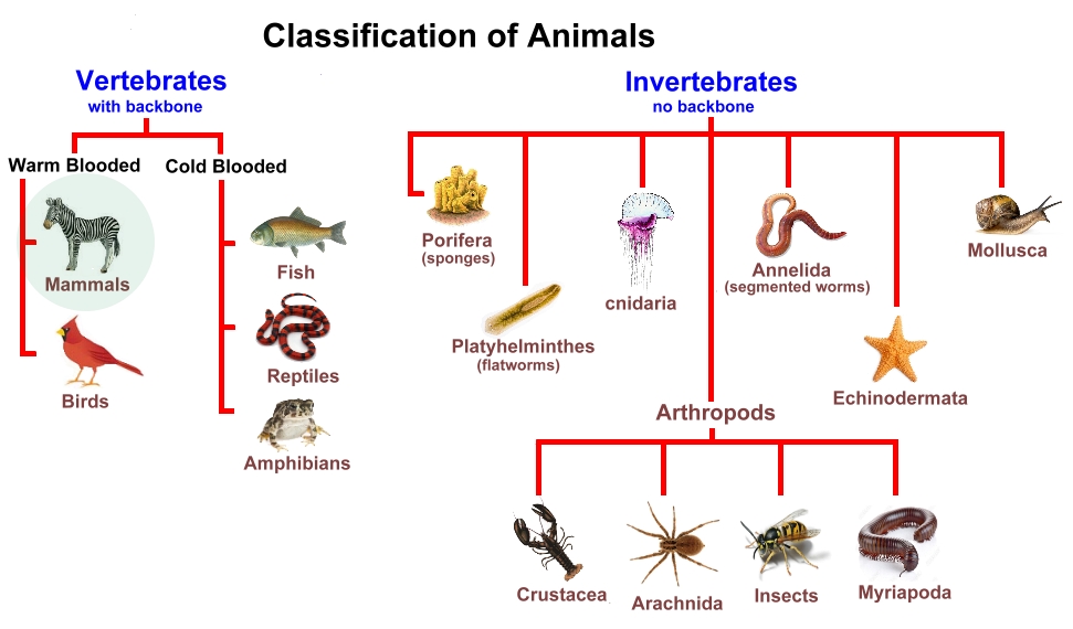 According to the taxonomy of living things, the phylum chordata (animals with backbones) is divided into five classes: fish, amphibians, reptiles, birds and mammals. Mammals include humans and all other animals that are warm-blooded, vertebrates, and with hair. They feed their young with milk from special mammary glands of the mother, and have a more well-developed brain than other animals. Hair is a mammalian feature, although not shared by all; in many whales, for example, it has disappeared. The mammalian lower jaw is hinged directly to the skull, instead of through a separate bone. A muscular diaphragm separates the heart and the lungs from the abdominal cavity. Other features of mammals: