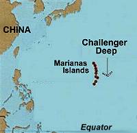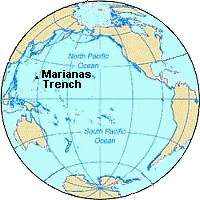 ![]() The Marianas Trench: It's the deepest spot in any ocean of the world. It is located in the Pacific Ocean, just east of the Phillippines. Nearby is the island of Guam, a U.S. Territory inhabited by natives identified as Chamorros. The Marianas trench is sometimes called the 'Challenger Deep' because it was located and named after His Majesty's Ship 'Challenger' of the British Royal Navy in the 19th century. The Marianas Trench's depth is about 10,924 m, or almost 11 km (7 miles). This is a height greater than any mountain on the surface of the earth! Plate Tectonics is a description of the surface of the earth. The interior of the earth, called the mantle, is hot, molten lava. The solid crust, which is in pieces, floats on this magma, much like the shell of chocolate on a dipped icecream cone sits on the icecream. As hot magma rises through cracks in the crust, it pushes pieces of crust apart. In other places, crust pieces are forced together, where they buckle to form mountains. The oceanic crust is much heavier than the continental crust, so when these plates crash into each other, the oceanic plate plunges downward toward the molten mantle, while the lighter, continental plate rides up over the top. The forces driving the two plates together are really intense, so the underlying oceanic plate (the 'subducted' plate) creates a trench where it drags the edge of the continental crust down as it descends underneath. (check out the picture). ![]() The really deep part of the ocean is in the bottom of the trench created by this subducting ocean crust. The Marianas Trench, for example, marks where the fast-moving Pacific Plate converges against the slower moving Philippine Plate. Subduction also results in the formation of volcanoes. Over millions of years, the erupted lava and volcanic debris from the escaping magma pile up on the ocean floor, until a submarine volcano rises above sea-level to form an island volcano. The Phillippines, the Marianas Islands are examples of this. Such volcanoes are typically strung out in chains called island arcs. As the name implies, volcanic island arcs, which closely parallel the trenches, are generally curved. Because of their nearness to the the tectonic activity below, they experience numerous strong earthquakes. ![]() Volcanoes can also form where the sea-floor crust passes over a 'hot spot' ... a spot where the crust is very thin and the hot layers below have broken through. As the moving crust passes over this hot spot, volcanoes form. The volcanoes sometmes reach all the way to the surface of the ocean, forming islands. As the crust continues to move, new volcanic islands are formed in sequence. This is how the Hawaiian Islands were formed; the island of Hawaii is currently over the hot spot. [Our thanks to Simon Jowitt of Camborne School of Mines in Cornwall, UK for correcting an error we made here]. Many strange creatures live in the perpetual dark and crushing pressure of this deep ocean floor. More to come. |