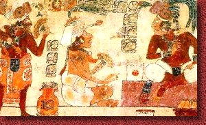 Mayan vase painting of the classic period (300-900 AD) The origins of Mayan civilization in Central America are not well understood. It probably began as early as 1500 BC; what we are most familiar with is the Classic period, which lasted from about AD 300 to 900, and saw the Mayan civilization flourish in the region. Great ceremonial centers were built throughout the whole of Central America. Mayan culture produced amazing art and architecture. Ruins remain at a large number of places in Central America. These sites were vast centers for religious ceremonies, and included a number of pyramidal mounds, with temples or other buildings, grouped around open plazas. Exteriors of buildings belonging to the wealthy were lavishly decorated with painted sculpture, carved lintels, stucco moldings, and stone mosaics. Agriculture was the basis of the Mayan economy, and corn was the main crop, although cotton, beans, squash, and cacao were also grown. The techniques of spinning, dyeing, and weaving cotton were highly perfected. The Maya domesticated the dog and the turkey, but had no draft animals or wheeled vehicles. They produced fine pottery. Cacao beans and copper bells were used as money. Copper, gold, silver, jade, shells, and colorful feathers were used as ornaments. Metal tools, however, were unknown. The tribes were ruled by hereditary chiefs; land held in common by each village was parceled out by village chieftains to separate families. Mayan art gave almost free reign to the artist, who was not required to produce a work that fit any particular rules or guidelines. Individual genius and its variations from one place to another produced products which were intended to be given or sold to the royalty of other cities. The study of these art works and the meaning they held for Mayans is called 'iconography'. Copan, in Honduras, is a site where many artworks of the Mayan culture remain. In particular, carvings called 'stelae' (inscribed stone slabs and pillars) show that the Mayans were capable of beautiful work, and used a lot of colour. Art has also been recovered from Guatemala and other nearby countries. In addition, the Maya in Mexico and the northern part of Central America produced intricate relief carvings ... sculpture in which the figures project from a background surface. This relief art either adorned buildings, or stood alone as stelae. Mayan sculpture often depicted rulers, gave dates and other information about them, and recorded important events. Females are depicted in many types of Mayan art. One common form is the clay figurine. As well, animals, birds, gods, mythical creatures, , and other deities of Mayan culture were depicted on pottery, as well as in sculpture. Pottery in the form of vases and bowls was often decorated with intricate paintings. Mayan art was probably produced only by the wealthy, as most people who lived in the culture were farmers who had to work hard to make a daily living. In fact, it is presumed that most of the art was done by sons of kings or other royalty, and that the artworks produced were given as gifts or sold to other wealthy landowners. Nevertheless, the art of pre-Columbus Central America as produced by the Mayan civilization during its Classic period is unrivalled in ancient times in its scope, beauty, and use of colour. |