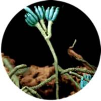 Mold is like a microscopic plant. Its spores are released from the 'flowers' at the tips of the stems.