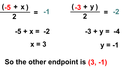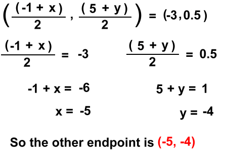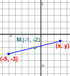 ![]() where (-5, -3) is one endpoint, (x, y) is the other, and (-1, -2) is the midpoint. We now have two equations to solve: