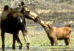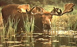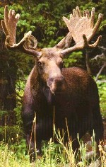 The moose is the largest member of the deer family, Cervidae. Its genus/species within that family is Alces alces, and there are subspecies of moose based on location: there is Alaska's Alces alces gigas, as well as the Canadian and American Alces alces americanus, and the European Alces alces machlis. Regardless of where they live, moose are herbivores, and ruminants, which means they eat vegetation (up to 10 kg per day) and digest it in multiple stomachs (four of them), regurgitating partially digested food to rechew it, like a cow. They are also crepuscular, which means they are most active at twilight. Height at the shoulders for an average moose is about 2 metres. Only the males have antlers, which are large and relatively flat. These antlers can have as many as 30 spikes, and their shape and distribution differs from animal to animal. Males, or 'bulls', shed their antlers once a year in early winter. New ones form in the spring; they're living tissue, nourished by blood vessels, and covered with a soft skin called 'velvet'. Eventually the inner tissue becomes a hard, bony extension of the skull, the velvet gets scraped off, and the antlers become solid and hard. Their main function is for display during the mating season (called the 'rut'), and dominance within the herd. Moose mothers are extremely aggressive, as are males in rut. Moose in general tend to be solitary animals, and if they travel in groups, it's usually ones with just a few adults. How much area a group of moose will claim depends on the availability of food and the climate, as well as the nature of the terrain. In Newfoundland, where the density of moose is as high or higher than anywhere else in the world, there are an average of 6 to 8 moose per square kilometre of woodland. That's a lot of moose! Other than man, who kills moose for sport, for meat, and by accident on the highways, the moose's main predator is the wolf. The wolf's constant attention keeps the moose herds healthy, by killing the weak and injured ones. Unless overhunted, moose do very well in the wilderness areas of North America. In fact, in many areas, hunting is a necessary measure to keep moose populations in check. Moose are not native to Newfoundland, for example; four were released in 1904 to supplement dwindling caribou herds, (Canadian Geographic, December 2000), and there are now an estimated 125,000 to 150,000 moose in that province! Moose on the highways in wilderness areas of North America pose a definite hazard, and are responsible for a lot of damage to vehicles and injuries to people, resulting in substantial repair and health insurance costs in some regions. Possible solutions that have been proposed include planting the sides of the road with vegetation that moose do not like to eat, and spraying the shoulders of the road with artificial wolf urine.