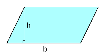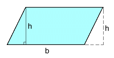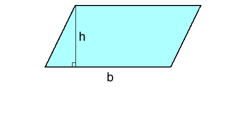 A parallelogram has opposite sides which are equal and parallel. The sides are usually labelled as base b and height h The area formula for a parallelogram is: A = b·h Here's why: