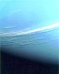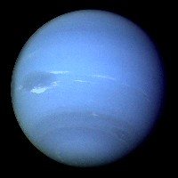 Neptune is a large gas giant planet, and is blue due to small amounts of methane floating in a thick atmosphere of (colourless) hydrogen and helium. When NASA's Voyager 2 spacecraft flew by Neptune in 1989, astronomers were amazed; instead of the dormant, dark, frigid planet they expected to see at the outer fringe of the solar system, they observed a turbulent, changing world.