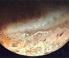 A thin atmosphere, perhaps 800 kilometers high, extends above Triton's surface. Tiny nitrogen ice particles form thin clouds a few kilometers above the surface. Triton is very bright, reflecting up to 95 percent of the sunlight that strikes it (by comparison, Earth's Moon reflects 11 percent). Triton appears to have the same general size, density, temperature and chemical composition as Pluto. There is a large south polar cap visible at the bottom of the image above; it may consist of a layer of nitrogen ice deposited during the previous winter.