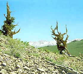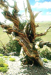 Some of the oldest living things on earth are Bristlecone pine trees, which can be found in the White Mountains of California. Many of them are over four thousand years old. Many of the trees living today were seedlings when the pyramids were being constructed, and mature trees in the time of Christ. These trees are ancient! The oldest Bristlecones live in exposed sites at high altitudes, with lots of space between each tree. Strangely, these trees thrive only in the harshest of environments. The White Mountains, which rise to over 14,000 feet, are east of the Sierra Nevada mountain range, and so they get almost no rain. They're one of the driest places on earth during the summer. The trees live in hilly areas at the 10,000 foot level, where it is cold and windy. How do these trees manage to live so long, in such a harsh environment, with strong winds, dry air, little rainfall, and very alkaline, sandy soil? The dry winds actually discourage insects, and help prevent fungus and rot. The tree's hard wood also provides protection from pests and disease. The Bristlecone pine uses almost all its energy for survival, rather than for growing. Its trunk may grow less than 1/100th of an inch per year, and trees reach a maximum height of about only 18 metres. Older Bristlecones may consist mostly of dead wood, with only strips of living bark. Bristlecones are also isolated, as few other species can survive the harsh conditions. Forest fires seldom happen, as the trees grow far apart, and their needles last 20 - 30 years, so there is little ground cover to spread flames. Bristlecones can remain standing for hundreds of years after death. They fall because the supporting roots finally decay, or are undermined by erosion. Yet even the oldest trees have the ability to produce seeds that will grow. The oldest living Bristlecone pine is named 'Methuselah', and is 4,767 years old. Methuselah is not marked or identified, due to the threat of vandalism; the U.S. Forest Service refuses to give its location or identity. But the trees weren't always as well protected. One even older tree was lost not long after it was discovered. In 1964, a researcher was taking core samples from some Bristlecones in Nevada, to determine their ages. When he discovered one that was over 4,000 years old , the U.S. Forest Service gave him permission to cut the tree down! Named 'Prometheus', the tree turned out to 4,950 years old, and was thought then to be the oldest known living thing on the planet. It was likely one of the oldest trees in the world even when Shakespeare was writing plays! UPDATES: Plants that are even older are being studied by scientists in the Mojave Desert. It is thought that some creosote bushes there may actually be as old as 7,000 years. But we now know of an even older living thing. Scientists in Sweden have discovered a 9,550 year old spruce tree in the mountainous Dalarna province of that country. A few other spruce trees in the region have ages that are almost as old. |