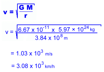 A circle has just one parameter, its radius r. The radius of a circular orbit is a measure of how far the satellite is from the central body.For example, the orbit of the Moon around Earth is a nearly circular ellipse with an approximate radius of 384,400 km. We can work out the ORBITAL SPEED of the Moon as it circles the Earth. To do this, we'll need to divide the distance it travels during one orbit by the time it takes. The distance around a circle is its circumference, given by the formula C = 2πr. The circumference of the Moon's orbit works out to be 2.42 x 106 km. The time for the Moon to complete one orbit is 27.3 days, or 655.2 hours, or 6.55 x 102 h. This is the PERIOD of the orbit. The Moon's speed can now be calculated by dividing the distance travelled by the time: v = d÷t = (2.42 x 106) ÷ (6.55 x 102) = 3.69 x 103 km/h. We can calculate the Moon's orbital speed another way, using a formula that comes from Newton's laws of gravity: ![]() This is in pretty close agreement with our previous calculation, considering all of the approximations we made, including an average value for the Moon's radius of (nearly circular) orbit.
