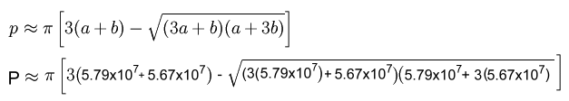 When the orbit of a satellite is clearly an ellipse with an eccentricity not close to zero, we'll have to use a different method to calculate orbital speed. We could just average the two radii a and b, and use that average for the 'average orbital radius', pretending the orbit is a circle, to work out an 'average orbital speed'. That's what's often done in high school physics textbooks. Let's see if we can be more accurate than that. The difficulty lies in the fact that there is no simple formula for the circumference of an ellipse. The famous Indian mathematician Ramanujan came up with several approximations; we'll use this one for the perimeter of an ellipse: