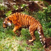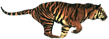 The tiger (Panthera tigris) is the largest of all cats, and one of the most fearsome predators in the world. A typical male Siberian tiger may weigh 230 kilograms (500 pounds), and measure more than three metres from its nose to the tip of its tail. Tigers roam over large distances, and can leap up to 9 metres in one jump. Tigers are at the top of the food chain: they eat just about anything, and nothing eats them. They have been known to eat crocodiles, fish, birds, reptiles, and even other predators like wolves, leopards and bears. However, to remain healthy they must include hoofed animals such as deer in their diet. The biggest prey animals, such as water buffalo, provide so much food that the tiger won't hunt again for a week. More than 36 kilograms (80 pounds) of meat may be eaten at one sitting. Hunting is often difficult, however, and tigers are only successful in one or two attacks out of every twenty. Tigers are usually solitary, and come together only to mate. Gestation lasts about three and a half months. Two or three cubs are normally born, inside a den made from thick vegetation, a cave, or a rocky crevice. Mother tigers nurse for three to six months, although the kittens may begin eating meat as early as two months old, and can hunt by the time they're one year of age. Cubs l stay with their mother for about 2 years. About half of all cubs survive to their third year. Male tigers roam a large territory, the size of which depends on the terrain. In Russia, territories may be as large as 1000 square kilometres, while a male tiger in India may occupy 100 square kilometres or less. Tigers mark their territories with urine, feces, and scratching on tree trunks. Tigers are Endangered: North American and Western European countries also are contribing to the killing of tigers; according to one recent investigation, 41% of traditional medicine shops surveyed in the U.S. sold medicines labeled as containing tiger or rhino parts. The last hundred years have seen major losses of wild tigers. By the 1950s, tigers living around the Caspian Sea were extinct. Populations of tigers that once inhabited the islands of Bali and Java are now extinct. The last Bali tiger was killed in 1937; the last Javan tiger sighting occured in 1972. India today has the largest number of tigers, with between 3,000 and 4,800. The South China tiger, with at best 20 to 30 individuals, is nearly extinct in the wild. The remaining wild tigers are threatened by many factors, including growing human populations, loss of habitat, illegal hunting of the tiger and the species they hunt, and a growing trade in tiger parts for traditional medicines. The World Wildlife Fund and many other organizations are now working to combat these threats, to try to save the tiger. You can help by visiting their website and making a monetary contribution. |