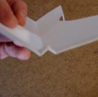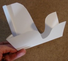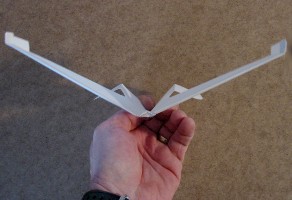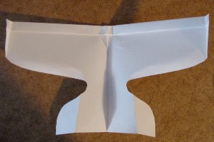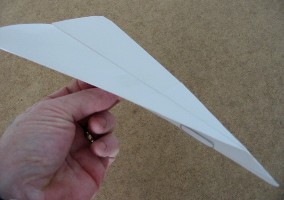 ![]() We also have a few designs you can try, with photographs and instructions. Making Your Airplanes Go Farther The best design for distance is a dart, as shown at the right. You should fold the wings towards the centre several times in order to make them very stiff, and use some tape at the top to hold them together. If the wings are stiff and a paperclip is added for balance, the distance your plane will travel is limited only by how fast you can throw it! Try experimenting with smaller darts made from stiff cardboard. you can launch them with an elastic band and make them travel 100 metres or more! Another interesting design that will travel long distances is the one shown below. In order to minimize drag, (the force of air friction) almost all of the non-wing parts are missing. This airplane is almost all wing! This design won't go as far as a dart (it can't be launched at the same high speed), but the distance it does travel will amaze you. Just fasten two loops to a straw ... the one in front should be slightly smaller. Make sure the loops point in the same direction. A paperclip adds balance. Making Your Airplanes Stay Up Longer and Do Tricks The airplane is made from a single sheet of paper. The wings don't have to be stiff, because you will launch it very slowly. Curved edges on the wing give it a lot of lift, and by changing their curvature, and the symmetry of the plane overall, you can make it turn and do loops. This design is called the 'Barnaby Flyer'. It was invented by Capt. Ralph S. Barnaby, USN (Ret), and it first appeared in his book "How to Make & Fly Paper Airplanes" (Scholastic Book Services 1968). The size and shape of the various parts of this plane are not critical. You don't have to measure anything, or cut especially carefully. We've even made one fly that we ripped out by hand, rather that cutting it out carefully with scissors. Begin by folding over the long edge of a sheet of paper continuously, until you almost reach the middle. Then crease and fold the sheet inwards (so the folded edge you just made is on the inside). Lay the folded paper flat, and trace the above design on one side. After cutting, the plane should look like the picture above left. Now fold the tail wings so that the angle of the fold makes an imaginary line to somewhere out in front of the nose, shown in the middle picture above. The next step is to put a curl on the main wings. Curl the edges downward with your finger. Try to make them curl smoothly, and identically on both wings. Examine your plane for symmetry. If the two sides aren't identically shaped, and identically positioned, the plane won't fly straight. The plane is launched slowly by pulling it forwards from the front, shown above right. After some experimenting, you should be able to get the plane to fly straight. Now try some aerobatics! If you change the curvature of the wings, vary the direction of the folded-up wingtips, and remove some of the symmetry, the plane can be made to do all sorts of turns and loops! |