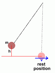 This gives us a way to measure the value of g, which, as you remember from the previous page, is not really constant. All we need to do is set up a pendulum and measure its velocity as it passes through the rest point, after releasing it from a height h above that point. This equation could be used to confirm that g is about 9.8 m/s2 on Earth. It could also be used on another planet to work out the value of g there. But you probably couldn't use this to measure changes in g from place to place on Earth, without accurate measuring devices.