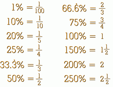 ![]() ![]() This page will show you three ways to do this problem. In order to understand what we'll show you, you need to understand what percents mean, and how to convert them to decimals or fractions. You also need to be able to reduce fractions. You also need to understand that when you find a percent of something, the answer has the same units as the number you are finding the percent of. For example: Now let's look at the three methods for finding a percent of a number: Method 1: The Quick and Easy Way: ![]() The easiest way to find a percent of a number is to know the fractional equivalent for some common percents. At the right are some of these often-used percents and the fractional value for each. You'll need to memorize these. Method 1 involves using the fraction instead of the percent. For example, if you were asked: you would instead ask yourself: This makes it easy to get the answer 18. The advantage of this method is that it is fast ... faster even than using a calculator. This will be a big advantage in later Math courses where you won't have a lot of extra time to do basic calculations. Here are some more examples: