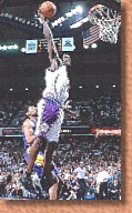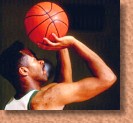 Understanding how things happen in a basketball game, from a physics point of view, is not necessary for a good player. A basketball player knows instinctively what to do in any given situation. Through thousands of hours of practice and game play, his brain has the correct sequence of muscle movements 'hard-wired' into it, much like you or I can walk without thinking about where to move the legs, and by how much. This is called 'kinesthetic memory'. A good pro basketball player has these game play reflexes because he began learning the moves as a child, when the brain is most receptive to imprinting a reflexive behaviour. It can be argued that such imprinting, through constant practice, must begin in childhood if the athlete is to become a star pro player. Nevertheless, it can be very useful to understand the physics behind some of the skills in basketball. A physical analysis of a player's movements, combined with a knowledge of the correct forces to apply at the right time, can be used to make a good player better. Scientific analysis like this is used in many sports, from figure skating to baseball. Let's look at some of the simpler physics rules being applied in every basketball game. Spinning the ball when you shoot is not done to affect air resistance, or to make air resistance cause the ball's path to curve, as is the case in baseball. ![]() The impact of a hard pass can be lessened, making it less likely the ball will knock the wind out of you, if it is caught into the body. The ball coming at you has momentum, m·v. By increasing the time over which you decelerate the ball, you lessen the force. In other words, since m·v = F·t, then F = (m·v) / t ... increasing t causes F to get smaller. This is the same principle that makes an air bag in your car work. The time over which you decelerate is lengthened, resulting in a lower force. Of course, catching a ball into your chest has other benefits. It makes it less likely you'll drop the ball, and harder for someone to grab. ![]() The more air pressure a basketball has inside it, the less its surface will bend or deform during a bounce, and the more its original energy will be stored in the compressed air inside. Air stores and returns energy more efficiently than the material that the ball is made from. If the ball is underinflated, some of its energy is wasted in deforming the ball as it bounces, and the ball will not rebound very high. For the most elastic collision possible between the ball and the floor, you want a highly pressurized ball. (But you knew that already, didn't you! Now you know why!) The material you bounce the ball on is also very important. Think about how high it would bounce on a carpeted floor. A soft floor material will flex when the ball hits it, and this will steal some of the ball's energy. Clearly the harder the surface, the better. A players' shoes must have good traction, which is the same as saying that the coefficient of friction between the shoe and the floor must be high. Friction is the force that opposes the motion of two surfaces that are in contact. Every surface is rough, on the microscopic scale, and when two surfaces come in contact, the high points on each surface temporarily make contact. The opposing or attracting forces of the surface molecules cause a 'frictional' force. A basketball player will also make use of static friction; a foot firmly planted, rather than slipping across the floor, will provide more friction when he has to stop or turn suddenly. This is because static friction ('pushing off') is greater than sliding friction ('sliding'). It is also why shoes must have a good grip on the floor in any direction you push off from, and why some shoes are unsuitable for basketball ... they may have lots of forward traction, but slip too easily when pushing sideways. It's just like driving ... spinning tires have less frictional force than non-spinning ones. ABS systems keep the tires from sliding, and maintain more friction. Pro basketball players seem to float in the air while they're at the basket with the ball. Of course, this is just an illusion; they fall at the same rate as they rose into the air, assuming they don't make contact with anything. What makes the time seem longer is probably because after their bodies reach their highest point, they extend their arms upward, giving the illusion that they're still going up. They are also moving forward when they jump, which also affects our perception of time. Here's an example. Imagine firing a bullet from a rifle, directly at a monkey hanging from the branch of a tree a kilometre away. If the monkey lets go of the branch just as you fire, will you hit him? Leaving aside the environmentally sensitive issue of whether or not we should be shooting monkeys out of trees, this is actually a well-known physics problem. In fact, the moment the bullet leaves your gun in a horizontal line, it will begin to fall. It will fall with exactly the same acceleration downwards as the monkey. Regardless of how far away the monkey is, when the bullet reaches the tree, it will have fallen the same distance as the monkey. It will hit him! This seems unlikely, since we usually visualize bullets as travelling in a straight line. But as any hunter will tell you, they do fall. If aimed horizontally, the bullet will hit the ground in the same time another bullet would, if you dropped it from the same height as your gun. The 'hang time' of a pro basketball player at the net seems longer because he is moving forwards and upwards. It is harder to consciously be aware of how long it took him to go up, when he is also moving forwards. But if you used a stopwatch and a slow-motion replay, you would discover that the time from when he left the floor to when he stops moving upward is exactly equal to the time he takes to fall, and there is no hang time! The instant he stops going up, he starts to fall. But this is hard to see when things happen fast and there is f
