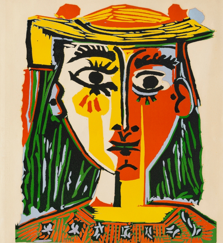 Buste de Femme au Chapeau (Girl with a Hat) is a linocut. Picasso experimented with linoleum by gouging a sheet of aluminum fused to a wooden block. The images produced were simple, bold, and this particular one is considered to be the greatest ever example of the technique.