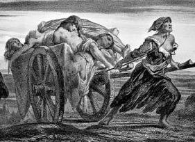The so-called 'Black Death' killed between 25 million and 50 million people in Europe during the 14th century. This was about 30% to 50% of Europe's population at the time. starting in 1348 when the plague reached London. The pandemic moved fast; it often killed a host within days of their first developing the high fever, the telltale rash, and the repellent buboes or swellings in the armpits and groin, which turned black and burst, expelling pus and bacteria. The disease spread through families, houses, villages, towns, and cities with terrifying speed and a high death rate. Hunger and poor sanitation made people vulnerable to sickness, and it spread to different countries through trade routes. Carts were used to transport the dead from the city to communal pits for burial. Many people use medieval artwork to show bubonic plague, but the people in the artwork are usually shown with sores all over. This isn't what plague looks like. The iconic artwork likely shows smallpox or leprosy.