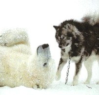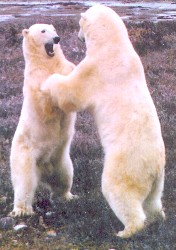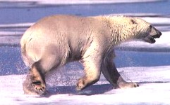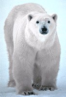Adult male polar bears weigh on average 1000 pounds, and can weigh up to 1500 pounds. females are considerably smaller, normally weighing up to 500 pounds. An adult polar bear's only enemies are humans, and occasionally other polar bears. In the wild, adult polar bears live an average of 15 to 18 years, though biologists have found a few that have lived to 30. In zoos, many captive bears live until their late 30s. The polar bear's diet consists mostly of the ringed seal. In winter, polar bears capture these seals by waiting near the seal's breathing hole. When the seal comes up for air, the polar bear grabs it. In summer, the bears sneak up on seals while they're sleeping on the ice ... the bear crawls slowly forward when the seal sleeps, and freezes in place when the animal raises its head. When close enough, the polar bear pounces, killing the seal before it can escape back into the sea. When a polar bear is sneaking up on a seal, it will often get down low to the ice so that its white fur blends in with the snowy background. The only part of the bear the seal can clearly see is its black nose ... which the seal mistakes for another seal far away. The polar bear is the only bear to be considered a marine mammal. Polar bears spend as much time on the ice and in the water as they do on land, and are excellent swimmers; they have been known to swim over 50 miles, at the sedate speed of six miles per hour. A polar bear's front paws are partially webbed and very large, to help it swim better. Fur between the pads help the bear sneak up quietly on its prey. The polar bear's fat layer, which is three to four inches thick, not only protects it from the cold, but gives it buoyancy in the water. Polar bears use their layer of fat to protect them from the cold air and cold water. Walrus, whales and seals also have layers of blubber, which help to keep them warm. The polar bear's fat layer is 4-5 inches thick, and is so effective that adult males quickly overheat when they run. Here's an interesting experiment you can do, to learn how good an insulator fat is ... visit our blubber experiment page. Because of their well-insulated body, polar bears give off no detectable heat; ... they don't even show up in infrared photographs. (Infrared film measures heat.) When a scientist attempted to photograph a bear with such film, he produced a print with a single spot ... the puff of air caused by the animal's breath! The bear's fur also helps keep it warm in an unusual way. Younger bears have fur that looks white (because of the refraction of light), but is actually translucent. Individual hairs act as 'light pipes', conducting light energy down to the skin, which is dark. As bears age, the fur begins to take on a slight yellowish colour due to continued exposure to sunlight. A female usually has two cubs. The mother gives birth to her cubs about two months after she enters the den in the fall. Newborns are about a foot long. Half of all cubs die in their first year, due to starvation, killing by hunters, or accidents. Polar bear cubs drink their mother's milk for almost 2 years, and depend on her for survival. As with most bears, the male may kill the cubs, although highly protective mothers are capable of driving off much larger males. Polar bears have distinct territories; a polar bear's home range can be enormous, far greater than that of any other bear. A single polar bear may rove across an area twice as big as the country of Iceland. Young polar bears may travel more than 1,000 kilometers (600 miles) to set up a home range apart from their mother's. However, there are distinct groupings of polar bears in the arctic regions around the world, and bears tend to stay within their own group's region, near their denning areas and the seals. The polar bear's sense of direction is phenomenal, and quite mysterious. It can unerringly find its way across the ice of frozen seas that are constantly breaking up and refreezing, and where there can be no recognizable landmarks. The polar bear, like brown and black bears, does not truly 'hibernate'. Though their heart rate slows, their body temperature does not drop dramatically, and while they may sleep, they have no difficulty waking up. Though brown and black bears sleep in winter, male polar bears do not. Only pregnant females spend the winter sleeping in a den, a two-chambered tunnel scraped into the snow. The female gives birth to her cubs late in the year. Polar bears are very intelligent, which can be seen in the various ways they stalk seals. A bear may drift in the water toward a seal on an ice floe, with only its head visible, mimicing a chunk of ice; when it gets close enough, it leaps out of the water and hits the seal with a paw. Polar bears have been observed to scrape the ice layer at a seal's breathing hole until it is paper thin, and then lie on top of the hole to simulate snow cover; the unsuspecting seal will surface right under the bear. Bears will also build a snow wall to hide behind as they wait for a seal to surface at a hole. Polar Bear Survival: Polar bears are a potentially threatened species. Because they live in and move through more than one country in the north, there is no single protection scheme to keep their numbers safe. In Norway, polar bears are completely protected, but scientists are worried about the effects of pollution on the bears. PCB levels in the polar bears of Norway and western Russia are two-and-a-half to seventeen times higher than those in North American populations. In Canada, Hudson Bay's ice melts about three weeks earlier each spring than it did just 25 years ago, which has greatly shortened the time that the bears can hunt for food. (Polar bears need a platform of ice from which to hunt seals.) Canadian scientists have observed that today's polar bears are smaller in stature, weigh less, and have fewer cubs. The bears in certain areas of Canada have excessive levels of PCBs and other contaminants. Native hunt
