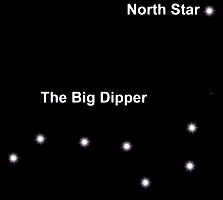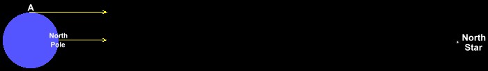 We received this question from a visitor to our site: "Is there a 'South Star'? In other words, is there a star equivalent to the North Star, that the south pole points to, to guide travellers in the southern hemisphere?" Did you know that the Big Dipper isn't really a constellation? It's an asterism, which is a special, recognizable group of stars. It's part of a bigger group, Ursa Major, which is a constellation. Ursa Major represents a big bear, and was named by the Romans. The handle of the Big Dipper represents the bear's tail; the cup is the bear's side. The star Polaris is in another constellation called the 'Little Bear', or Ursa Minor. It was the first star named in that constellation, so is also referred to as Alpha Ursae Minoris. As the earth spins on its axis, once every 24 hours, the stars in the sky seem to move around the earth. If you could follow them as they turn through the sky, you would notice that Polaris does not appear to move. This is evident on long exposure photographs made at night; the stars form circular paths around the sky, as the earth turns, with Polaris in the centre of the circles, unmoving. Polaris is in the same direction as the north pole of the earth, so following the North Star will lead you toward the north. Its height above the horizon, in degrees, is also your latitude. (See our page about the north pole for an explanation). Why does Polaris lead you toward the north pole of the earth? Here's the same picture as above, turned on its side. The north rotational pole of the earth points toward Polaris. But this star is 300 light years from Earth, or about 3000 trillion kilometres, or 3,000,000,000,000,000 km. This distance is so large that, as far as we on the surface of the earth (point A) are concerned, it's at infinity. In other words, the line of sight to Polaris from a person at Did you know that Polaris has not always been the 'North Star', and won't be, in the future? The Earth spins on its axis just like a gyroscope, and 'precesses' as it spins. The rotational axis slowly changes direction, in a circle, over thousands of years. Currently it points within one degree of Polaris. During the past 5000 years the axis has pointed at the star Thuban (Alpha Draconis); in the year 7500 the North Star will be Alpha Cephei; in the year 15,000 it will be the star Vega. About 9000 years after that, Polaris will again become the North Star.