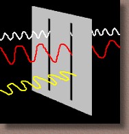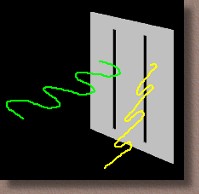 In actual situations where we want to polarize light, we often want some of the normal light to get through too, so we can see the object we're looking at. This is achieved by making slits, which are actually long narrow scratches, on a piece of glass. The scratches must be very narrow and close together, because individual light waves are tiny. A bit of normal light can still get through the glass between the scratches, but most of the light is forced to try to vibrate through them ... and only the light vibrating along the length of a 'scratch' can get through.