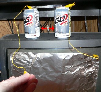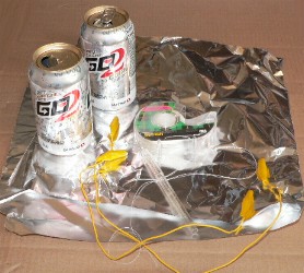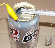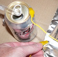 ![]() ![]() The items you'll need are shown at the left. They include the two pop cans, a pull-tab from one of the cans, tape, a sheet of aluminum foil, a short length of thread, a barrel from a cheap ballpoint pen, and two pieces of coated wire each about 30 cm long. We used wire test leads with alligator clips at the ends to make it easier to attach the wires, but if you don't have any of these, you can attach the wires with the tape. You'll also need access to an older television, since it's going to provide the power for our motor. Don't worry ... this is not a dangerous project. ![]() ![]() ![]() The pictures above illustrate how to build the motor. Begin by removing the innards from the pen barrel, and taping about 5 cm of thread to the middle. Tie the other end of the thread to the pull-tab. With the two pop cans side by side, about 7-8 cm apart, lay the pen across their tops so the pull-tab hangs down half-way between, at about the middle of the cans. Attach one of the wires to the top of the can on the left. Attach the other wire to the top of the can on the right. Then fasten the other end of the right wire to the edge of the piece of aluminum foil. Now move the whole setup to the top of your TV, and press the foil smoothly to the screen of your television. (It's easier if the TV is off when you do this). Hold the left wire in your hand ... your body will act as a ground. Turn on the TV. The pull-tab will begin to move back and forth, making a clicking noise as it hits the can on each side. Your motor is running! Here's how it works. ![]() The aluminum foil spread over the screen collects this voltage, and sends a current of electrons through the motor and into your body. You won't feel anything. (Although it's high voltage, the current is quite small ... similar to the current in a static electric shock you get by scuffing your feet on a carpet and touching someone). Both cans become negatively charged because of the excess electrons. The pull-tab remains neutral because it is insulated from the current by the pen barrel. The negative charge on the right can repels the electrons that are in the pull-tab. These can't escape the pull-tab, but they move to the side away from the right can, leaving the side of the pull-tab closest to the right can positively charged. The pull-tab is then attracted toward the right can. When the pull-tab touches the right can, extra electrons from the can jump onto the pull-tab. This makes the pull-tab negatively charged too. Now it's repelled from the right can. Now the negatively charged pull-tab is moving toward the left can, which is also negatively charged. The negatively charged pull-tab repels electrons from the surface of the left can, which becomes positively charged. It now can attract the pull-tab. When the pull-tab touches the left can, the excess electrons jump off the pull-tab onto this can. This leaves the pull-tab neutrally charged, so it is free to swing back ... and then the process begins all over again. The motor will continue to run as long as the TV is left on to act as a source of electrons. Although the current involved is similar to a static electricity charge, we discovered that touching the foil or the cans while the motor is running, or even afterward, results in quite a large shock ... not dangerous, but certainly startling. |