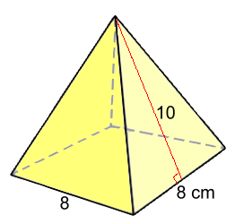 Example 5: Find the surface areaS.A. = L2 + 2L·S S.A. = 82 + 2(8)(10) S.A. = 224 cm2 Note the use of brackets to show substituted numbers that are multiplied. If we know the height of the pyramid but not the slant height, we'll need to solve for S first:
