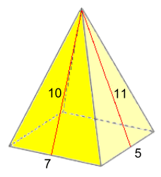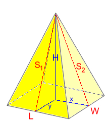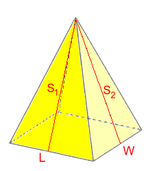 Rectangle Base PyramidsThe complication here is that the triangular faces are different; there are two pairs of different triangular sides. S.A. = L·W + 2(L·S1÷2) + 2(W·S2÷2) S.A. = L·W + L·S1 + W·S2
