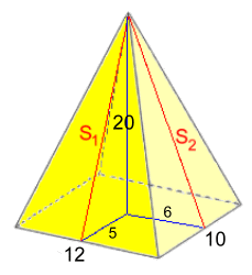 S12 = 202 + 52S1 ≈ 20.62 S22 = 202 + 62 S2 ≈ 20.89 S.A. = L·W + L·S1 + W·S2 S.A. ≈ 12·10 + 12(20.62) + 10(20.89) S.A. ≈ 576.3 cm2 |