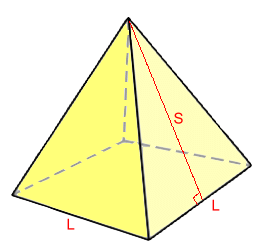 Square Base PyramidsThe surface area is made of a square base (area = L·L) and four identical triangles (A = b·h/2) around the sides. We will need to know the height of each of these triangles, which is also the slant height S of the pyramid. S.A. = L ·L + 4(L·S ÷ 2) S.A. = L2 + 2L·S