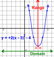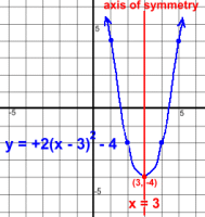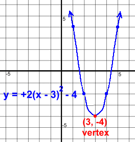 The basic parabola is y = 1x2 with vertex (0, 0), at the top of the pageThe +2 tells you that it opens up (+) and it's steeper than y = 1x2 The -3 with the x tells you it shifts the parabola right 3. This shift is opposite to the sign in the bracket The -4 at the end tells you it shifts the parabola down 4. This shift is NOT opposite to the sign With these two shifts, the vertex moves from (0, 0) to (3, -4) Here is more information about the graph: