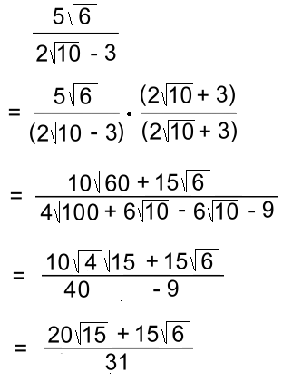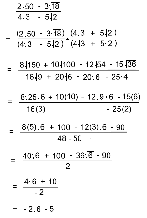 The conjugate of the denominator is (4√3 + 5√2) FOIL on the top and on the bottom Evaluate all the perfect roots Combine like terms and simplify Both terms on top must be divided by -2 This type of question results in one of the longest solutions in high school math, with the exception of some differentiation questions in calculus (Math 31). |