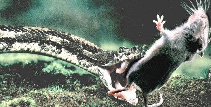 A Timber Rattler strikes a mouse, burying its fangs in the body.