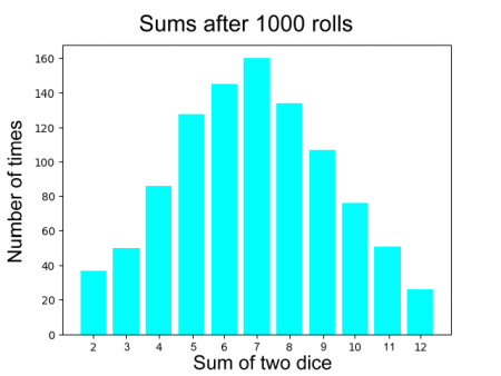 But his will be a lot of work; you'll need to roll the dice at least a thousand times to get a clear idea of how often each sum comes up. So we did the work for you. Before we look at the results, let's go over exactly what's happening: What happens if we roll two dice? We want to know what the sum of the two dice will be. All sums in between two and twelve are possible. How many different combinations are there? Here's a summary of all the possible combinations: 2 - 1 2 - 2 2 - 3 2 - 4 2 - 5 2 - 6 3 - 1 3 - 2 3 - 3 3 - 4 3 - 5 3 - 6 4 - 1 4 - 2 4 - 3 4 - 4 4 - 5 4 - 6 5 - 1 5 - 2 5 - 3 5 - 4 5 - 5 5 - 6 6 - 1 6 - 2 6 - 3 6 - 4 6 - 5 6 - 6 There are 36 different possible combinations of the two dice. Based on this table, which lists all the possible combinations which could theoretically occur, let's look at some theoretical probabilities. A sum of two happens 1 time in thirty six possibilities. Thats 1 out of 36, or 2.8% of the time. A sum of three happens 2 times in thirty six possibilities. Thats 2 out of 36, or 5.6% of the time. A sum of four happens 3 times in thirty six possibilities. Thats 3 out of 36, or 8.3% of the time. A sum of five happens 4 times in thirty six possibilities. Thats 4 out of 36, or 11.1% of the time. A sum of six happens 5 times in thirty six possibilities. Thats 5 out of 36, or 13.9% of the time. A sum of seven happens 6 times in thirty six possibilities. Thats 6 out of 36, or 16.7% of the time. A sum of eight happens 5 times in thirty six possibilities. Thats 5 out of 36, or 13.9% of the time. A sum of nine happens 4 times in thirty six possibilities. Thats 4 out of 36, or 11.1% of the time. A sum of ten happens 3 times in thirty six possibilities. Thats 3 out of 36, or 8.3% of the time. A sum of eleven happens 2 times in thirty six possibilities. Thats 2 out of 36, or 5.6% of the time. A sum of twelve happens 1 time in thirty six possibilities. Thats 1 out of 36, or 2.8%% of the time. Here's the result in chart form: ![]() Notice that of the thirty-six possible sums, a sum of seven came up six times. This is more times than any other sum. This represented 16.7% of the possibilities. From examining what could happen, based on the possible sums we could get when rolling two dice, we've calculated the theoretical probability. For example, we now know that the theoretical probability of getting a sum of seven is 6 times out of 36, or 16.7%. sum of seven 16.7% of the time. Specifically, if we roll the dice 1000 times, we should expect to get a sum of seven on 16.7% of the rolls, or 167 times, Let's do the experiment and see if that's true. We rolled the pair of dice 1000 times, and recorded the sums. Then we counted how many times each sum happened in the thousand rolls. Here's the results we got, in graph form: ![]() The first thing that's obvious is that the shape of the graph, while very similar to the theoretical results, is not quite the same. For example, the theoretical expectation for rolling a sum of two was the same as for rolling a twelve, but here in the experiment they're different. Similarly, the number of times that seven was rolled was only about 160, which differs from the expected result of 167. None of the experimental results match the predicted results exactly. Here's what's happening: