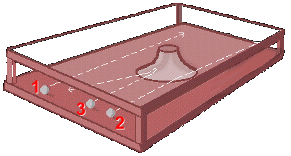 ![]() This is a simple box with no sides. The top has been removed in this diagram so you can see the path of each ball as it is rolled through the box. This device can simulate the Rutherford scattering experiment. Balls can be rolled through the box, and the person rolling the ball can't see the obstacle that's in there, which should be small compared to the size of the boards. (We've shown it larger here for clarity). Most of the balls (1) will pass right through; a few (2) will be deflected slightly, and a very small number (3) will be deflected at large angles. Students can make guesses at what's in there, and what shape it is. The truncated curved shape in the centre can be anything that has curved sides, but it should not have a lip on the bottom. Finding just the right shape is the challenge! We've tried a thin circular piece of stretchy balloon rubber, glued and stapled all around its edge to the bottom board, and pulled upwards at the centre and attached to the top board. Attaching it was not easy ... next time we build one of these, we're going to find a plastic object that's shaped just right! [NOTE: This curved shape (representing the nucleus) in the centre actually has a proper shape, such that the height of any point on its surface should be proportional to 1/r, where r is the distance of that point from the centre of the shape. But for purposes of the demonstration, that much accuracy is probably unnecessary.] |