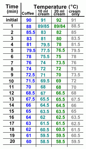![]() Observations and Conclusions: The blue line is the black coffee cooling curve. When you add creamer to the coffee, the temperature immediately drops, but not by a great amount. This is because we are only adding a small amount of creamer to the coffee, and it's not very cold. The amount of creamer added in each test (10 ml and 20 ml) was meant to simulate real conditions. Adding very cold creamer would increase the initial drop in temperature. This is additional testing that should be done to complete this experiment; every experimental result should suggest new things to check out. I didn't follow up on this, but you should in any experiment you do. The first thing I noticed in the graph above is that the cooling curves for all the samples are very similar, if not identical, after about only two minutes. Black coffee, coffee with creamer, or even straight creamer, all seem to cool at the same rate. The only difference is that in the samples with creamer added to coffee, the temperatures are always a few degrees cooler than the black coffee; however, the difference in temperature is only a few degrees ... not enough to notice when drinking ... and the difference gets smaller as time passes. Moreover, look at the curves for black coffee (blue) and straight creamer (grey). They are just about identical! The above observations led me to conclude that our hypothesis was incorrect. It doesn't matter whether you add creamer to your coffee or not ... the cooling rate will be the same after the first few minutes if you add the creamer a minute after you get the coffee. Waiting to add the creamer until you're ready to drink the coffee (maybe after 10 minutes) does not make sense, since at that point the temperature would drop well below that of coffee where the creamer was added at the beginning. To keep your coffee warmer longer, add the creamer within the first minute. (Note that this is not because coffee with creamer cools more slowly, as we guessed; it's because after 10 minutes or so there won't be much difference between the temperature of the black coffee and the temperature of the coffee with creamer added right away; adding creamer to the black coffee then will make it cooler than if you'd added it originally). Here's another place where additional testing should be done. I should have compared the temperatures of coffee with creamer added at the start to coffee with creamer added after 10 minutes or so. Don't be afraid to go back and do more testing to answer additional questions or back up your conclusions. The second thing I remarked on is how similar the cooling curves are for all the liquids. The thickness of the mixture seems to have had no noticeable effect on the rate of cooling, after a few minutes or so. Since you might expect some sort of difference to have occurred, it is now necessary to come up with some sort of explanation for this result. I suspect that the cooling rate does not change noticeably because creamer is mostly water; the difference in viscosity between coffee and even straight creamer is probably too small to affect the rate of cooling. This suggests some further research we might do to see if we're correct. We won't do it here, but it's something you should do in any experiment you conduct. |