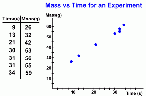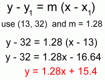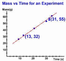 ![]() Finding the Equation of the Line This page will show you how to find the equation of the line of best fit. First we'll do the calculations on paper, using the point-slope formula. Then we'll show you how to make your TI83+ calculator do all the work! ![]() It represents data collected in an experiment, where we measured the mass of a solid that formed in a beaker after leaving it for a specified time. Each data point represents the mass of one sample (in grams) and the time it took to form (in seconds). The data generate a very strong positive correlation. In order to predict how much mass will be present after 250 seconds, we will draw the line of best fit and find its equation. Method 1: Using the Point-Slope Formula ![]() At the right you can see the line drawn. We did this by 'eye', so our calculations below will only be approximations. We've also identified two points; the points used must be on the actual line. First we'll use those points to find the slope m of the line: ![]() Then we'll use the point-slope equation to find the line's equation: ![]() Using the variables from the problem, the equation is: mass = 1.28 x time + 15.4 or M = 1.28·t + 15.4 We can now use this equation to predict the mass after 250 seconds: M = 1.28(250) + 15.4 = 335.4 grams . Remember: because there is some variability in where to locate the line of best fit, the equation for that line is only an approximation. This will always be true when the correlation is anything but perfect (ie: the points don't line up perfectly). However the equation does describe the direction of the points on the graph, and is useful for making predictions like the example above. |