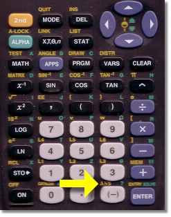 The answer key is above the (-) sign key; you will have to press the yellow '2nd' key first to access it.