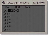 We just want to enter one line equation. Next to Y1, enter 2X+3 [locate the X key] Your screen should look like the right.