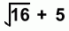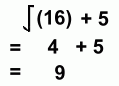 ![]() Since that's all there is, close the brackets before pressing 'Enter': ![]() Obviously the answer is 4. Even if you forget to close the bracket, the calculator will still give you 4. However, you should get into the habit of always closing the bracket, or you will forget to do it when it's really necessary and will get the answer wrong! Here's what we mean. If you had to do this question: ![]() ... you would want the answer to be 4 + 5 = 9 However, if you enter it on the calculator without closing the bracket: ![]() ... the calculator will do the square root of 21 and get 4.582575695 This is what you want the calculator to do: ![]() When you use a key that inserts a bracket, you must close the bracket before entering any more numbers. Other functions besides the square root provide brackets like these; whenever they're inserted, be sure to close them, even if you think you don't need to. |