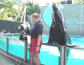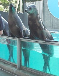 Sea lions, fur seals, seals and walruses as a group are called called pinnipeds, which are all aquatic carnivorous mammals with flippers instead of arms and legs. Their streamlined bodies and flippers allow them to move quickly through water. Sea lions, however, are quite different from true seals. The California sea lion, for example, has visible external ear flaps, unlike a seal (which just has ear holes), and the sea lion can walk on his front and back flippers (the seal just crawls). Adult females (shown at the left) are much smaller, growing to only about 160 kg (350 lb). Pups are born in June or July, and weigh 5 or 6 kg. They nurse from 6 months to a year. Pups are born with a black coat, which changes to brown after about three weeks. Sea lions in the wild may live up to 18 years. Those in captivity have been known to live 23 years or more. California sea lions can swim up to 40 km/h in short bursts. They often dive to depths of 100 metres, with recorded maximum dives reaching California sea lions are social animals, and congregate in large groups on the beach and while floating on the ocean. They are known for their intelligence, playfulness and noisy barking, and are easily trained. The body of a sea lion is so flexible that it can bend over backwards and just about touch its nose to the tips of its back flippers. California sea lions are warm-blooded mammals, with a thick layer of blubber to insulate them against the cold. Their short fur mainly serves to protect their skin when climbing out of the water onto rocks. Even on crowded rookeries, (beaches where thousands of sea lions congregate), California sea lion females and pups always recognize and can find each other. They accomplish this mainly through smell and sounds. They see much better underwater; on land they are somewhat nearsighted! Sea lions will eat whatever is available, including squid, octopus, herring, rockfish, smelt, hake and lamprey. Their only natural predators are Killer whales and Great White sharks, ... but man contributes to sea lion deaths through ocean pollution, illegal shooting, and entanglement in fishing nets. California sea lions can be found all along the Pacific coast from Vancouver south to the southern tip of Baja, California. Years ago there was also a population off the coast of Japan. Unfortunately, it was hunted to extinction. |