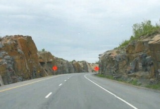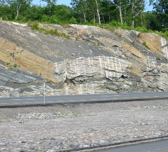 ![]() The shield is mostly thin soil lying on top of bedrock, with many bare outcrops and thousands of lakes. This was caused during the last ice age, when glaciers covered the area and scraped the rock clean as they moved. A few million years of advancing and retreating glaciers have actually carried pieces of the shield into southern Ontario and the northern United States ![]() The shield was originally a region of very large mountains and some volcanic activity, but over the millennia the area was eroded. Mountains have deep 'roots', and float on the denser mantle below. As mountains erode, their roots rise, and are slowly eroded as well. The rocks that now form the surface of the Canadian Shield were once far below the earth's surface. The high pressures and temperatures at those depths created many forms of minerals in the rocks. Since the end of the last ice age - 15,000 years ago in southern Ontario, but only about 6,000 years ago in northern Quebec - the land has become covered with a thick boreal forest of coniferous trees. Today, much of the Canadian Shield is home to mining industries of various sorts, as well as logging and other forestry-related industries. As you drive through northern Ontario, the Canadian Shield bedrock is clearly visible, especially in areas where the highway is being widened. Unlike in other regions where highway construction involves merely moving around a lot of dirt, in northern Ontario, making a road is a major undertaking! ![]() ![]() The hills are solid rock, and must be blasted literally to pieces with dynamite. This is not so easy when vehicles are passing by on the highway; construction teams spread huge 'blankets' of old tires over the rock face to be blasted, and traffic is stopped until after detonation. Then heavy equipment clears away the pieces of rock, which are used to fill in low areas. ![]() ![]() In the two pictures above, you can see how far down the surface rock had to be removed to make a level road. Clearly visible are the layers in the rock, layers that were folded in gentle curves millions of years ago by the intense heat and pressure deep underground. Also visible in these pictures are many vertical 'white stripes' in the rock that are actually the drill holes where dynamite was inserted to blast apart the rock. ![]() At the right you can see the final result ... a highway that cuts right through the top layers of the rock of the Canadian Shield. One unfortunate side-effect of building highways here is that the steep rock walls that the highway passes through don't allow for errors on the drivers' part ... if you go off the road at high speed, your accident will likely be fatal. The Canadian Shield stretches over much of Northern Ontario and Michigan. Despite being separated by Lake Superior, these two regions share many geological features, one of which is plentiful deposits of iron ore. The iron (actually iron oxide, or rust) in the exposed rocks colours them red in some regions. There is actually a town in Northern Ontario called Red Rock. The iron oxide in the rock also gets into the mix they use in both regions for asphalt, giving the highways in both places a red tint. The rock in northern Minnesota and Michigan, across Lake Superior, is the same. ![]() ![]() The largest Ontario city on the Canadian Shield is Sudbury. Sudbury is named after a town in England. Located just north of the Great Lakes, about 4 hours north of Toronto, the region is thought to be the site of an asteroid impact with the earth many millions of years ago, as the underlying rock contains a vast deposit of minerals. The small town of Copper Cliff (now a part of Greater Sudbury) is the location of a huge complex of mines, smelters, and refineries, which since the late 1800's have been in place to extract this mineral wealth from the ground. The area produces nickel, copper, silver, iron ore, and various other valuable minerals. I grew up there. When the area was originally settled in the late 19th century, most of the timber was cut down, a lot of it to fuel the giant smelters which melted the rock to allow the minerals to be removed. The fumes from these operations (which included the noxious and toxic sulphur dioxide) also served to kill off much of the remaining vegetation. For most of the 1900's the region around Copper Cliff was a barren wasteland of exposed rock, as well as slag (worthless rock) left over from smelting operations and dumped wherever it was convenient. Nevertheless, the region prospered, as there was a large world-wide demand for the metals being produced, particularly nickel. The city of Greater Sudbury became one of the largest cities in northern Ontario. Huge smokestacks, and later a single 'superstack', allowed much of the sulphur dioxide to blow somewhere else*, leaving the air reasonably clean, and allowing vegetation to return. In recent decades, both the city and the principal mining company have undertaken a reclamation project, in which topsoil, grass and trees have been put in place over the rock and slag dumps. ![]() ![]() I visited Sudbury and Copper Cliff during the summer of 2004 to see how it had changed since I was growing up there in the 50's and 60's. Despite the fact that the region's mines and smelters are no longer the biggest or most productive in the world, the region has definitely continued to prosper. The greening program has created a startling transformation ... there is grass and vegetation everywhere! The picture at the left just above shows what was once a huge slag dump area, barren of everything except crushed rock. it is now (at least, as seen from the highway) a pleasant vista of green rolling hills and trees. The picture at the right is a typical small street in Copper Cliff, with the superstack visible in the background. Since this stack went into operation, the town seldom has to put up with the clouds of sulphur dioxide that used to make just breathing an unpleasant experience. There are m