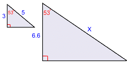 We know that the triangles are similar because all three pairs of correxponding angles are equal. (The diagram doesn't have to label the third pair; if two corresponding angles are equal, the third pair must be too. Here they would be 37°). This means corresponding sides must be in the same ratio. We can use this to find side x. x must equal 6.6 5 3 x = 6.6 5 3 Cross multiply: 3x = 33 x = 11 This method can be used to solve practical problems: