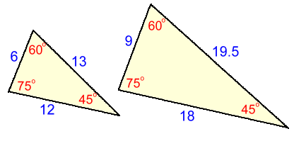 Unlike congruent triangles which are identical in size and shape, similar triangles are not the same size, but they do have the same shape.This is because: - corresponding angles are the same - corresponding sides are in the same ratio In this example, the sides of the large triangle are all 1.5 times as long as the sides of the small one. The fact that the sides are in the same ratio can be used to solve for missing information in a problem. For example: