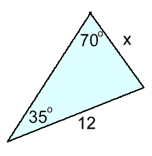 x 12 -------- = -------- sin35 sin70 x·sin70 = 12·sin35 x = 12·sin35 / sin70 = 7.3 rounded to 1 d.p. Example 2: Find side X