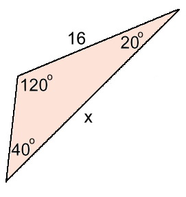 x 16--------- = -------- sin120 sin40 Notice that we must use 16 and angle 40° x·sin40 = 16·sin120 x = 16·sin120 / sin40 = 21.6 rounded to 1 d.p. Next let's look at how to find a missing angle >>> |