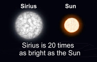 Sirius is the brightest star in the sky and the fifth nearest to Earth, at a distance of 8.6 light-years, twice the distance of the nearest known star system beyond the Sun, the Alpha Centauri system. It is a binary star. The bright component of the binary is a blue-white star over 20 times as luminous as the Sun. It has a radius 1.71 times that of the Sun, and a surface temperature just over twice that of the Sun.