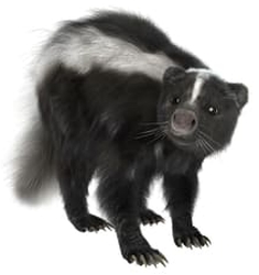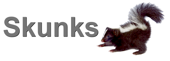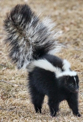 The common striped skunk (Mephitis mephitis), at left, is found from central Canada south to northern Mexico. Adults are about 80 cm long and weigh 6.3 kg. Their fur is black with a white V down the back, and a white bar between the eyes.The Eastern Spotted skunk (Spilogale putorius) at right, is found from southwestern Canada to Mexico. Their spots are actually a series of interrupted stripes running down their back and sides. Spotted skunks are the smallest skunks, about the size of tree squirrels. Skunk scent comes from anal glands located inside the rectum at the base of the tail. All carnivores have anal scent glands, but they are extremely well-developed in skunks. Each of the two glands has a nipple associated with it, and skunks can aim the spray with highly coordinated muscle control. When a skunk is being chased by a predator but can't see it, the spray is emitted as a cloud that the pursuer must run through. This usually is enough to deter most predators. When the skunk has a target to focus on, the spray is emitted as a stream directed at the predator's face. Although accurate to about two metres, its total range is considerably farther. ![]() A skunk will go through a series of threat behaviours before it sprays. Striped skunks will face an adversary head-on and stamp their front paws, sometimes charging forward a few paces or edging backward while dragging their front paws. When they actually spray, they can bend so that they simultaneously face their head and tail at the antagonist. Spotted skunks perform a handstand and approach predators.