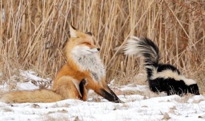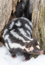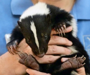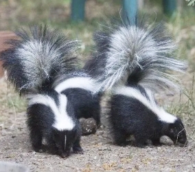 The chemical composition of skunk spray differs among species, but sulfur compounds are primarily responsible for its strength. Sulfur has a rotten egg scent, making a skunk's spray extremely pungent. The scent is so strong it can be smelled up to a kilometre away, and can linger for days to weeks. Their spray can also cause stinging of the eyes, temporary blindness, and nausea. Baby skunks, called kits, can spray when they're just eight days old. That's around two weeks before their eyes open! Striped skunks spend most of their time on the ground and are less agile than spotted skunks. Striped skunks are omnivorous, feasting on insects, small vertebrates, and eggs, as well as vegetable matter. Skunks remain solitary except during the breeding season, though in colder climates females may den together. After mating, the male is driven off, and the female raises the litter of 2 to 12 kits alone. Kits are born from about the end of April through early June. Despite their unique method for defense, skunks are eaten, mostly by great horned owls but also by vultures, eagles and other raptors, crows, coyotes, foxes, dogs, bobcats, mountain lions, American badgers, and even humans. Automobiles are a major cause of mortality for skunks in Ontario and the United States. Most skunks prey primarily on insects, especially those harmful to agriculture. Skunks are also very useful in destroying rats and mice that commonly infest farm buildings. Spotted skunks are particularly efficient hunters because they are quick and are able to follow rodents into smaller spaces than larger skunks can. However, in some areas of North America, skunks are a major carrier of rabies, which is fatal to skunks. Although striped skunks can be domesticated and their scent glands removed, they do not generally make good pets.