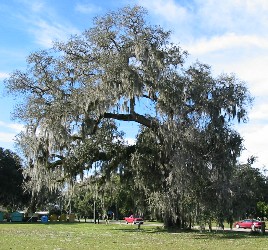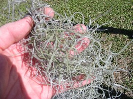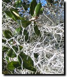 ![]() ![]() It seemed to be everywhere, not only covering the trees, but also hanging from telephone wires, fences, and occasionally even roofs. A local resident informed us that this was Spanish Moss. Not being familiar with this type of plant, we immediately assumed it must be some sort of parasite. Is it really a moss? Does it live on nutrients it receives from the trees? What does it look like up close? We did a little research, and were amazed at what we learned. We'll share it with you here, along with some pictures we took of this amazing plant. The first thing we discovered is that Spanish Moss is not a true moss at all, but is actually more closely related to the pineapple tree! Moreover, it is not a parasite! While it clings to the tree for support, it is not directly attached, and receives no nourishment from the tree. Rather, Spanish Moss is an epiphyte. Epiphytes do not draw nutrients from the host plant, but absorb water and food from the air directly though their stems and leaves. Through the process of photosynthesis, just as in ordinary plants, the chlorophyll in the epiphyte converts water and CO2 into carbohydrates. Other examples of epiphytes include some tropical orchids, and some ferns. Spanish Moss can be found in the U.S. from Virginia southwards, and all the way down to Argentina in South America. Native Americans called the plant 'tree hair', a name which the French explorers turned to 'Barbe espagnole', or 'Spanish Beard', to insult their Spanish rivals in the New World. The Spanish in turn named it 'Cabello francés' ('French hair'). 'Spanish Moss', a milder variation of the French insult, has survived. Another common name is 'Graybeard'. Small stems grows after about two weeks, and these stems will extract most of the plant’s nutrients from its surroundings. The plant will also absorb some nutrients from matter that has decayed on the tree. The plant’s external scales may also absorb minerals from tree leaves. A host tree may suffer if a particularly thick growth of moss blocks out sunlight, but Spanish Moss normally does no harm to the trees it hangs from. However, Spanish Moss can absorb water up to ten times its own weight, and will often crack the branch on which it has grown after a particularly heavy rainfall. Strangely, despite the fact that the plant does not physically attach itself to trees, the moss will grow only on trees, and not on fences, telephone poles, buildings or even on vines; whatever clumps of Spanish Moss happen to be found on these surfaces have fallen there, or have been blown from trees by the wind. Spanish Moss creates an ecosystem that shelters many creatures, including chiggers, rat snakes, and three species of bats. One species of spider, Pelegrina tillandsiae, lives only in Spanish Moss. We weren't aware of this when we were examining strands of the moss and taking these pictures; fortunately the strands we held seemed to be free of inhabitants! Birds also use Spanish Moss to build or hide their nests, and the parula warbler makes its nest in the actual hanging clumps of the moss. Squirrels, owls, egrets and mockingbirds also use Spanish Moss for nest bedding. Colonists also mixed moss and mud together to make the walls of their cabins. Dried moss also made good kindling for the fireplace. Commercial uses for Spanish Moss have included packing material, saddle blankets, bridles, braids, and twine to repair fishermen’s nets. Apparently Henry Ford stuffed the seats in his first Model Ts with Spanish Moss. Nowadays, Spanish Moss is mostly used just for arts and crafts. But scientists have also discovered that testing samples of the moss, especially ones that hang near major highways, can measure how much air pollution exists, since the plant will absorb such heavy metals as lead, copper, nickel, and manganese from the air along with its nutrients. |