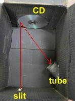 ![]() A spectroscope is a device that splits a light beam into the different wavelengths contained in the beam. By passing the light from a glowing gas through a thin slit and then causing it to split, you will see images of the slit at all the different wavelengths emitted by the atoms in the gas. This technique can be used to identify substances, since every atom emits light at different wavelengths. ![]() The idea for this project came from the excellent book "Gonzo Gizmos" by Simon Field, which contains a variety of projects in physics and electricity. It can be ordered from his website www.scitoys.com, where you can also find all sorts of scientific devices and materials; we highly recommend it. The spectroscope we will build uses two single-edge razor blades to form the slit. These can be purchased in most hardware stores (they're used for scraping paint). The light will be split by a music CD, which contains many finely etched lines side by side. (A prism would also work, but the construction would be more difficult). We'll view the split light beam through a cardboard tube; all of the pieces will be mounted inside a small box. ![]() ![]() ![]() You'll also need some aluminum tape (not duct tape) to seal the box, making it light-tight. (You can also use aluminum foil and tape). A sharp knife will be needed to cut the holes, and some tape is necessary to attach things. A pencil/pen will be used to mark the holes for cutting. We also sprayed the inside of the box and tube with flat black paint to cut down on reflections. First let's locate the hole for the viewing tube. We'll use the CD as a guide, placing it along the bottom edge of the box at the left, and marking an 'X' at the centre. Now trace around the end of the tube, centred on the 'X'. Next, slide the end of the tube about a centimetre to the right and make another circle. Use these two circles to cut out an oval shape. This will allow the tube to enter the box at an angle. ![]() ![]() ![]() ![]() Now turn the box to the left, and once again place the CD along the bottom edge, at the left, and mark an 'X' at the centre. Cut out a 4cm x 1cm slit centred on this 'X'. ![]() ![]() ![]() Make the sharp edges nearly touch, leaving a narrow opening that's the same width all the way down. Be sure not to put any tape over this opening between the blades. ![]() Next, tape the CD to the back wall of the box, with the label side touching the wall. The light entering from the slit needs to hit the centre of one side of the CD, and then reflect into the viewing tube. When testing the spectroscope, we found that we had to open up the box and move the CD slightly to get the image centred properly. This could also be accomplished by changing the angle of the viewing tube. The final step is to seal all cracks and openings with the aluminum tape. The box must be completely light-tight, except for the viewing tube and slit. (If you want to improve the appearance of your spectroscope, you might also spray-paint the entire box ... just be sure not to get any paint in the slit between the razor blades). ![]() ![]() ![]() ![]() Go on to page two and we'll show you some photographs of light spectra we obtained with our spectroscope. We'll also tell you what a spectroscope is used for. |