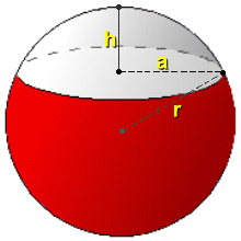 In the yellow right triangle we use the Pythagorean Theorem:r2 = a2 + (r - h)2 a2 = r2 - (r - h)2 a2 = r2 - (r2 - 2rh + h2) a2 = r2 - r2 + 2rh - h2 a2 = 2rh - h2 Surface Area of Cap: SA = area of outer side of curved part + area of circular baseSA = 2πrh + πa2 SA = 2πrh + π(2rh - h2) SA = 2πrh + 2πrh - πh2 SA = 4πrh - πh2 SA = πh(4r - h) Surface Area of Calotte: