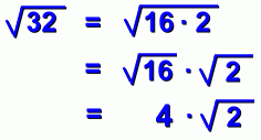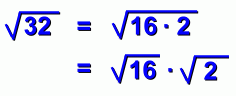 ![]() page two Let's look at the square root of 32 again: ![]() We're going to exchange 32 for a pair of numbers that multiply to 32. There are several possibilities. Here's the one we're going to pick: ![]() We picked 16 and 2 for a reason. 16 is the biggest perfect square that's a factor of 32. What does this mean? Well, you already know that square roots multiply together. So we can do this: ![]() And now, because 16 is a perfect square, its root is 4: ![]() What we've done is change the square root of 32 into 'four times the square root of 2': ![]() ![]() Because the number under the radical sign is smaller, the root is considered to be simpler. Of course, not all square roots can be simplified. Here's one that won't simplify: ![]() (There is no pair of factors of 30 such that one of them is a perfect square) Let's do another example ... |